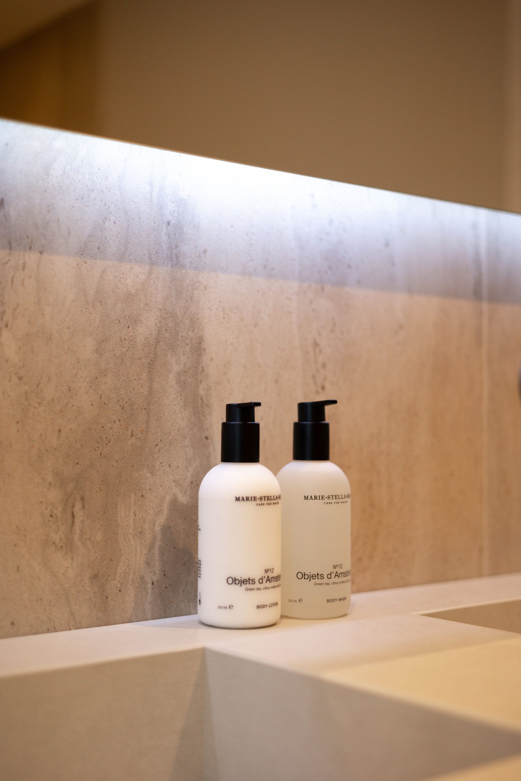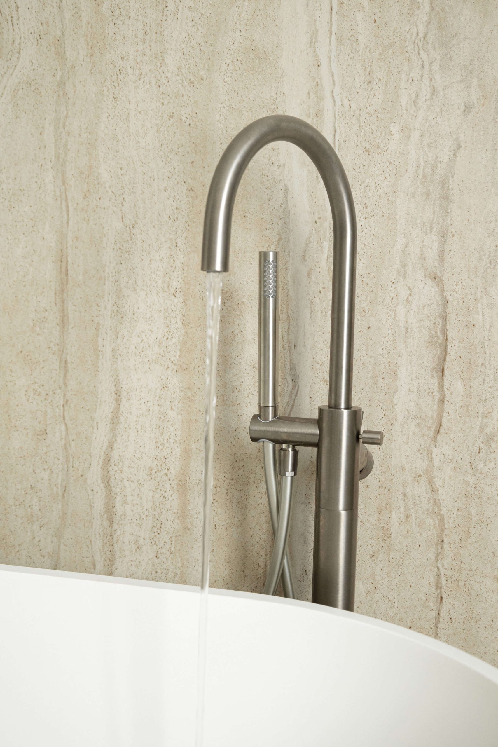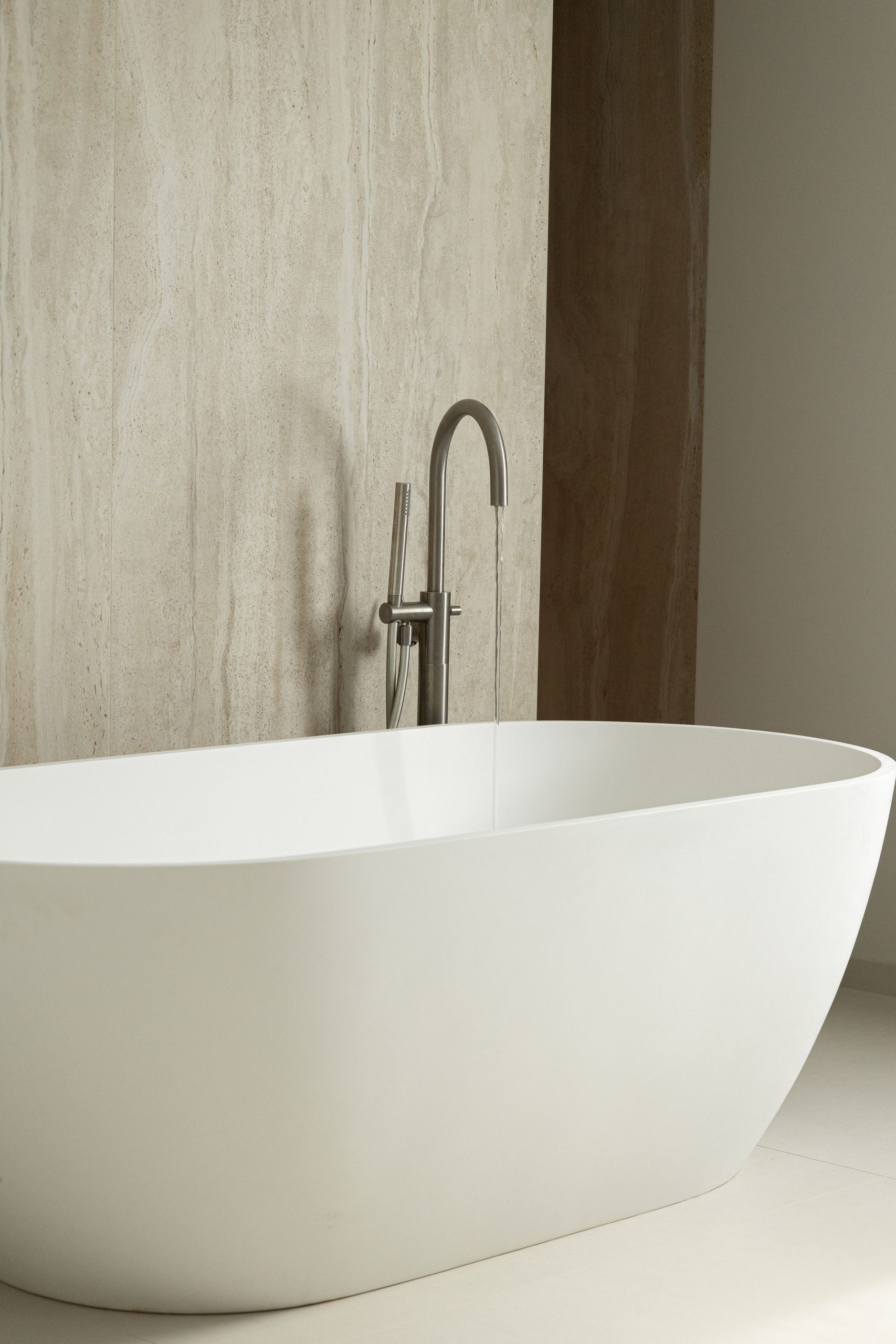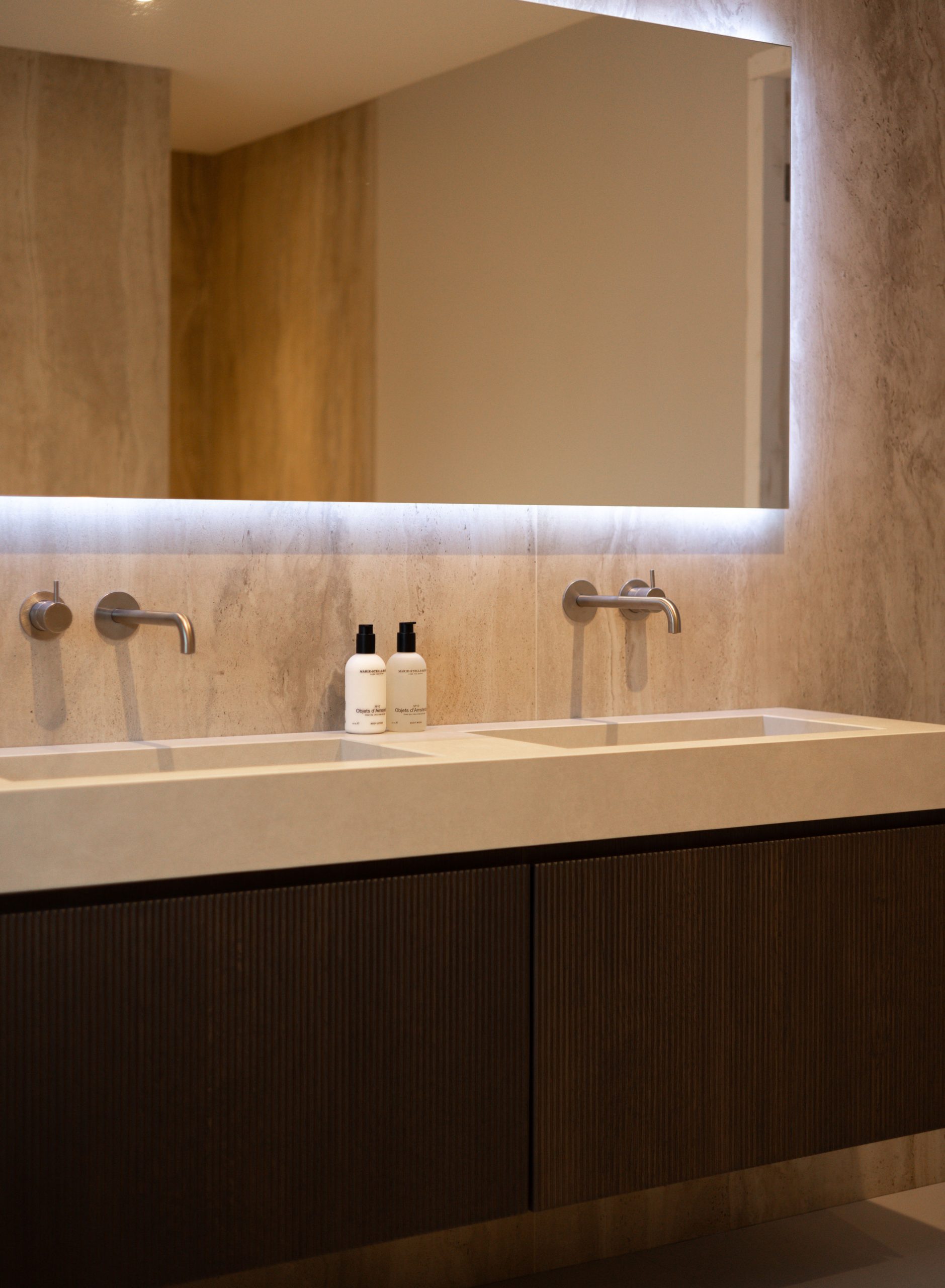 De keuze voor grootformaat tegels was essentieel in het ontwerp van deze badkamer. Door het minimaliseren van voegen en het creëren van een bijna naadloos oppervlak, versterken deze tegels het gevoel van ruimtelijkheid en openheid in de badkamer. De subtiele kleurnuances en natuurlijke adering van de travertin look voegen warmte en diepte toe aan de ruimte, terwijl het keramische materiaal zorgt voor duurzaamheid en eenvoudig onderhoud.